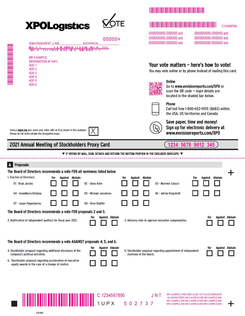 MMMMMMMMMMMM MMMMMMMMMMMMMMM C123456789 000000000.000000 ext 000000000.000000 ext 000000000.000000 ext 000000000.000000 ext 000000000.000000 ext 000000000.000000 ext 000004 ENDORSEMENT_LINE______________ SACKPACK_____________ MR A SAMPLE DESIGNATION (IF ANY) ADD 1 ADD 2 ADD 3 ADD 4 ADD 5 ADD 6 Your vote matters heres how to vote! You may vote online or by phone instead of mailing this card. Online GIof ntoo welwewct.reonnviicsivoontrienpgo, rts.com/XPO or delete QR code and control # scan the QR code login details are located in the shaded bar below. Phone Call toll free 1-800-652-VOTE (8683) within the USA, US territories and Canada Save paper, time and money! Sign up for electronic delivery at www.envisionreports.com/XPO Using a black ink pen, mark your votes with an X as shown in this example. Please do not write outside the designated areas. q IF VOTING BY MAIL, SIGN, DETACH AND RETURN THE BOTTOM PORTION IN THE ENCLOSED ENVELOPE. q + The Board of Directors recommends a vote FOR all nominees listed below 1. Election of Directors: 01 - Brad Jacobs For Against Abstain For Against Abstain For Against Abstain 02 - Gena Ashe 03 - Marlene Colucci 04 - AnnaMaria DeSalva 05 - Michael Jesselson 06 - Adrian Kingshott 07 - Jason Papastavrou 08 - Oren Shaffer The Board of Directors recommends a vote FOR proposals 2 and 3. For Against Abstain For Against Abstain 2. Ratification of independent auditors for fiscal year 2021. 3. Advisory vote to approve executive compensation. The Board of Directors recommends a vote AGAINST proposals 4, 5, and 6. For Against Abstain For Against Abstain 4. Stockholder proposal regarding additional disclosure of the companys political activities. 6. Stockholder proposal regarding acceleration of executive equity awards in the case of a change of control. 5. Stockholder proposal regarding appointment of independent chairman of the board. MMMMMMM 03FXKB C 1234567890 J N T 0 2 7 3 7 MR A SAMPLE (THIS AREA IS SET UP TO ACCOMMODATE 140 CHARACTERS) MR A SAMPLE AND MR A SAMPLE AND MR A SAMPLE AND MR A SAMPLE AND MR A SAMPLE AND MR A SAMPLE AND MR A SAMPLE AND MR A SAMPLE AND + 1 U P X 5 MMMMMMMMM A Proposals 2021 Annual Meeting of Stockholders Proxy Card1234 5678 9012 345