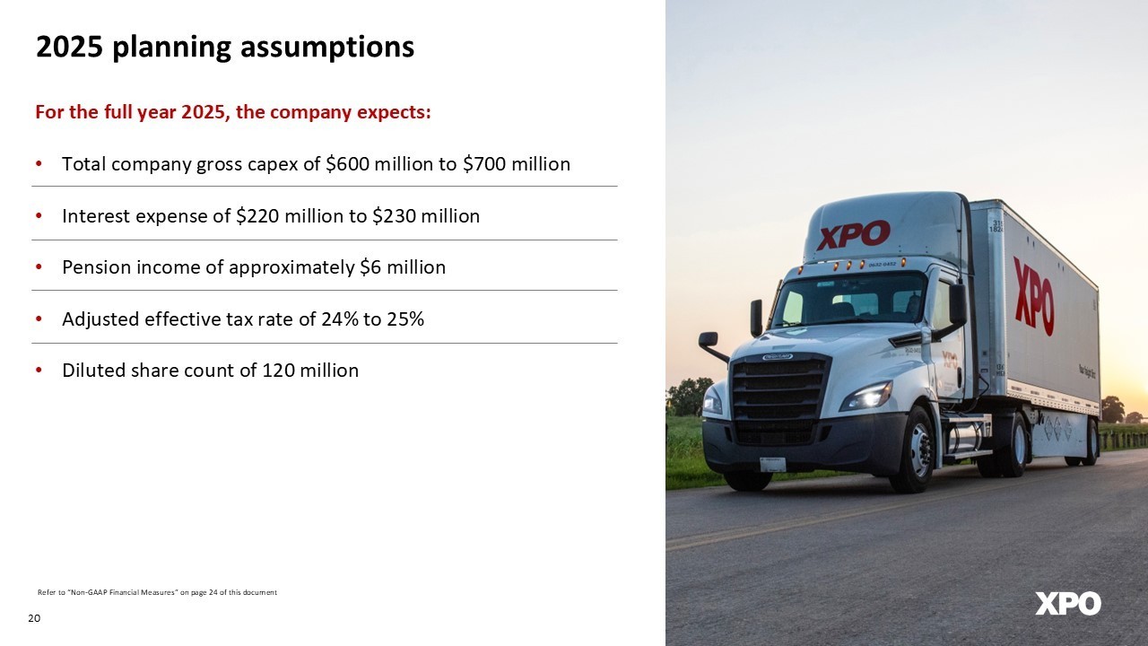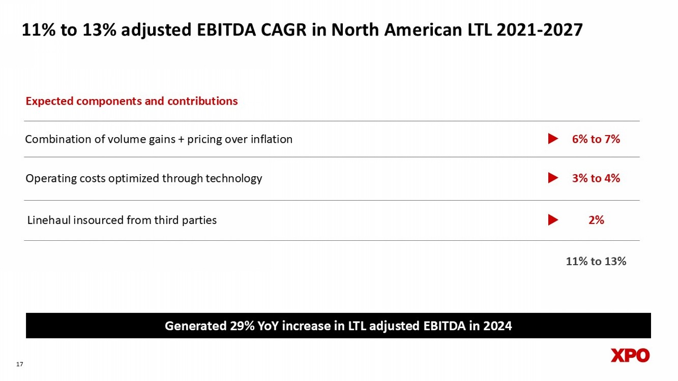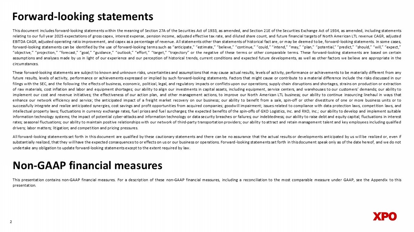 dNon - GAAP financial measures As required by the rules of the Securities and Exchange Commission (“SEC”), we provide reconciliations of the non - GAAP financial measures contained in this document to the most directly comparable measure under GAAP, which are set forth in the financial tables attached to this document . This document contains the following non - GAAP financial measures : adjusted earnings before interest, taxes, depreciation and amortization (“adjusted EBITDA”) on a consolidated basis ; adjusted net income from continuing operations ; adjusted diluted earnings from continuing operations per share ("adjusted EPS") ; adjusted operating income for our North American Less - Than - Truckload segment ; adjusted operating ratio for our North American Less - Than - Truckload segment ; and adjusted effective tax rate . We believe that the above adjusted financial measures facilitate analysis of our ongoing business operations because they exclude items that may not be reflective of, or are unrelated to, XPO and its business segments’ core operating performance, and may assist investors with comparisons to prior periods and assessing trends in our underlying businesses . Other companies may calculate these non - GAAP financial measures differently, and therefore our measures may not be comparable to similarly titled measures of other companies . These non - GAAP financial measures should only be used as supplemental measures of our operating performance . Adjusted EBITDA, adjusted net income from continuing operations, adjusted EPS, adjusted operating income and adjusted operating ratio include adjustments for transaction and integration costs, as well as restructuring costs, and other adjustments as set forth in the attached tables . Transaction and integration adjustments are generally incremental costs that result from an actual or planned acquisition, divestiture or spin - off and may include transaction costs, consulting fees, stock - based compensation, retention awards, internal salaries and wages (to the extent the individuals are assigned full - time to integration and transformation activities) and certain costs related to integrating and converging IT systems . Restructuring costs primarily relate to severance costs associated with business optimization initiatives . Management uses these non - GAAP financial measures in making financial, operating and planning decisions and evaluating XPO’s and each business segment’s ongoing performance . We believe that adjusted EBITDA improves comparability from period to period by removing the impact of our capital structure (interest and financing expenses), asset base (depreciation and amortization), tax impacts and other adjustments as set out in the attached tables that management has determined are not reflective of core operating activities and thereby assist investors with assessing trends in our underlying businesses . We believe that adjusted net income from continuing operations and adjusted EPS improve the comparability of our operating results from period to period by removing the impact of certain costs and gains that management has determined are not reflective of our core operating activities, including amortization of acquisition - related intangible assets, transaction and integration costs, restructuring costs and other adjustments as set out in the attached tables . We believe that adjusted operating income and adjusted operating ratio improve the comparability of our operating results from period to period by removing the impact of certain transaction and integration costs and restructuring costs, as well as amortization expenses . We believe that adjusted effective tax rate improves comparability of our effective tax rate, by excluding the tax effect of special items . With respect to our targets for : ( i ) the North American less - than - truckload segment’s adjusted EBITDA CAGR and adjusted operating ratio for the six - year period 2021 through 2027 and (ii) the 2025 adjusted effective tax rate, a reconciliation of these non - GAAP measures to the corresponding GAAP measures is not available without unreasonable effort due to the variability and complexity of the reconciling items described above that we exclude from these non - GAAP target measures . The variability of these items may have a significant impact on our future GAAP financial results and, as a result, we are unable to prepare the forward - looking statement of income and statement of cash flows in accordance with GAAP that would be required to produce such a reconciliation . 24