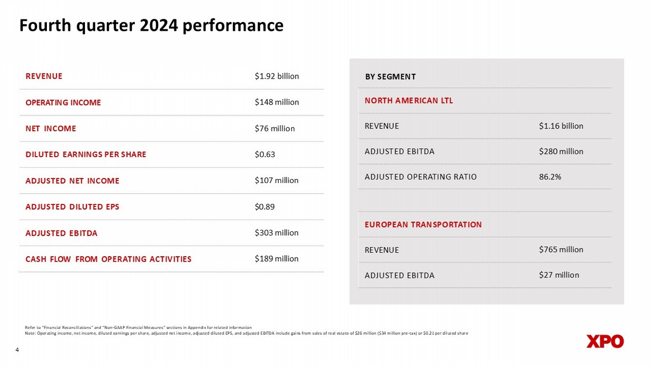 Fourth quarter 2024 highlights $148 million of operating income, up 24% YoY $303 million of adjusted EBITDA, up 15% YoY $0.89 of adjusted diluted EPS 1 , up 16% YoY LTL adjusted operating ratio of 86.2%, improved by 30 bps YoY LTL adjusted EBITDA of $280 million, up 20% YoY LTL purchased transportation expense reduced by 47% YoY LTL yield, excluding fuel, up 6.3% YoY LTL revenue per shipment, excluding fuel, up 5.8% YoY LTL damage claims ratio of 0.2% Improved full - year LTL adjusted OR by 260 bps, better than our target range 1 Diluted earnings from continuing operations per share Refer to “Financial Reconciliations” and “Non - GAAP Financial Measures” sections in Appendix for related information 3