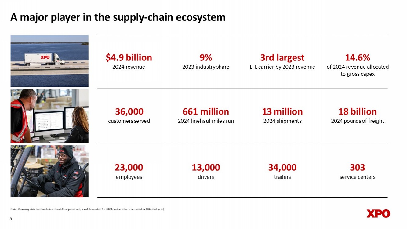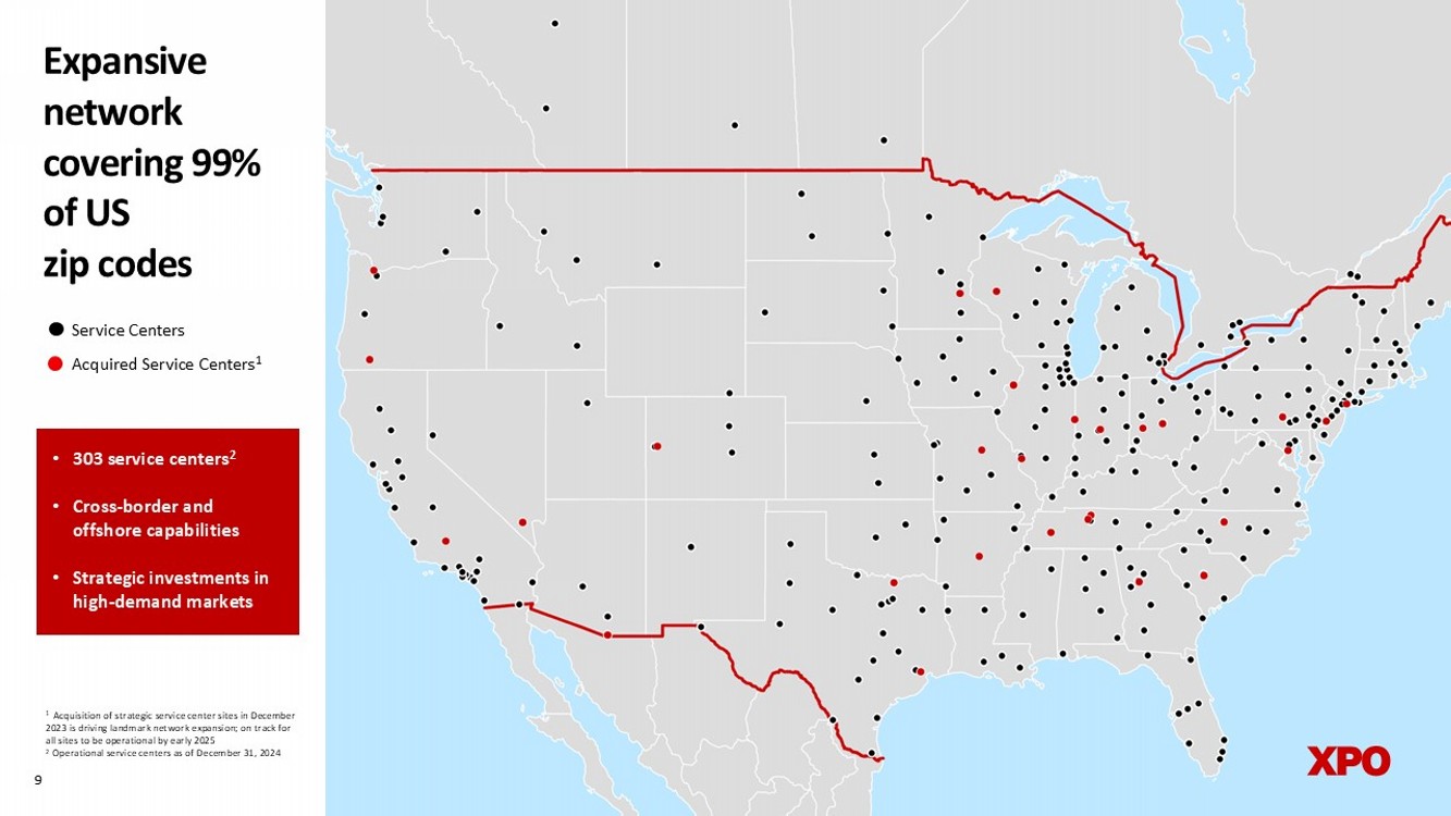 A major player in the supply - chain ecosystem Note: Company data for North American LTL segment only as of December 31, 2024, unless otherwise noted as 2024 (full year) 3 rd largest LTL carrier by 2023 revenue 14.6% of 2024 revenue allocated to gross capex 13 million 2024 s hipments 36,000 customers served $4.9 billion 2024 revenue 9 % 2023 industry share 8 13,0 0 0 d rivers 34,0 0 0 t railers 18 billion 2024 pounds of freight 661 million 2024 l inehaul miles run 2 3 ,0 0 0 e mployees 303 service centers quarterly (bring back