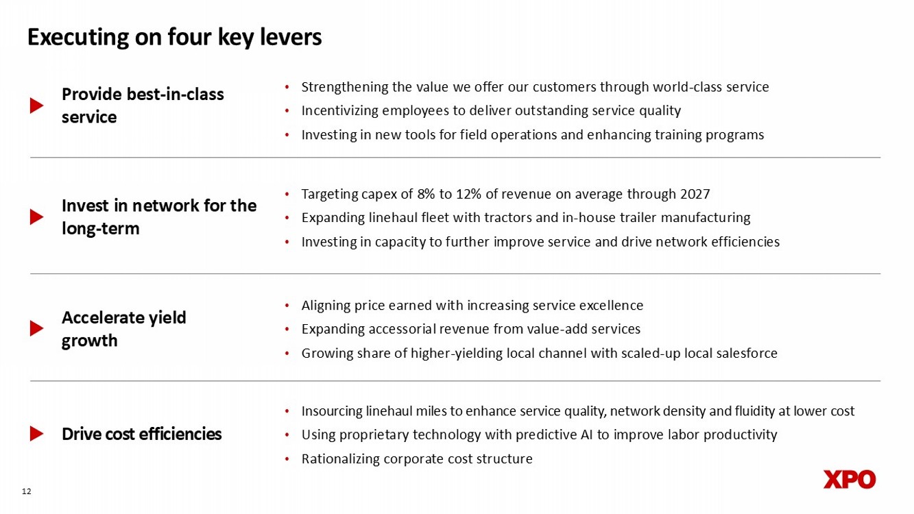 Provide best - in - class service Accelerate yield growth Drive cost efficiencies • Aligning price earned with increasing service excellence • Expanding accessorial revenue from value - add services • Growing share of higher - yielding local channel with scaled - up local salesforce • Insourcing linehaul miles to enhance service quality, network density and fluidity at lower cost • Using proprietary technology with predictive AI to improve labor productivity • Rationalizing corporate cost structure 12 Executing on four key levers • Strengthening the value we offer our customers through world - class service • Incentivizing employees to deliver outstanding service quality • Investing in new tools for field operations and enhancing training programs Invest in network for the long - term • Targeting capex of 8% to 12% of revenue on average through 2027 • Expanding linehaul fleet with tractors and in - house trailer manufacturing • Investing in capacity to further improve service and drive network efficiencies