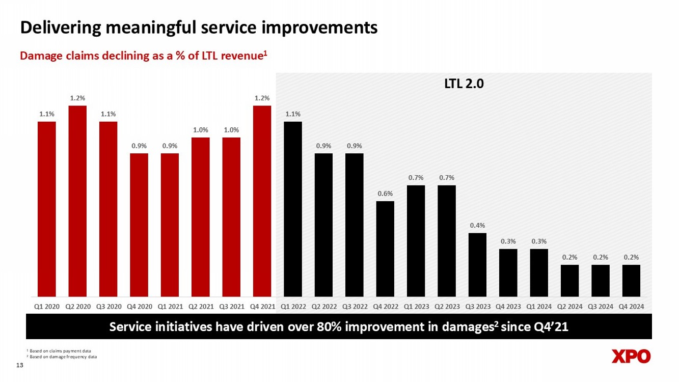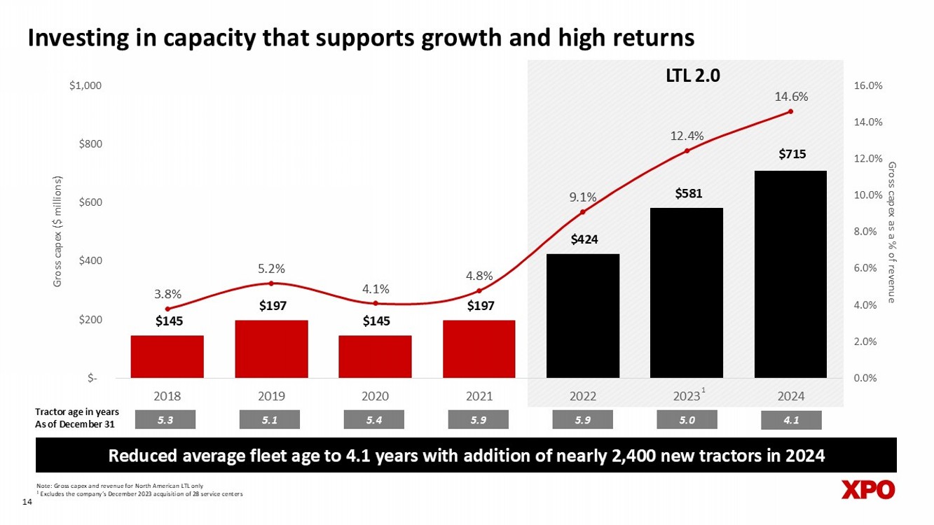 1.1% 1.2% 1.1% 0.9% 0.9% 1.0% 1.0% 1.2% 1.1% 0.9% 0.9% 0.6% 0.7% 0.7% 0.4% 0.3% 0.3% 0.2% 0.2% 0.2% Q1 2020 Q2 2020 Q3 2020 Q4 2020 Q1 2021 Q2 2021 Q3 2021 Q4 2021 Q1 2022 Q2 2022 Q3 2022 Q4 2022 Q1 2023 Q2 2023 Q3 2023 Q4 2023 Q1 2024 Q2 2024 Q3 2024 Q4 2024 1 Based on claims payment data 2 Based on damage frequency data 13 Service initiatives have driven over 80% improvement in damages 2 since Q4’21 Delivering meaningful service improvements Damage claims declining as a % of LTL revenue 1 LTL 2.0