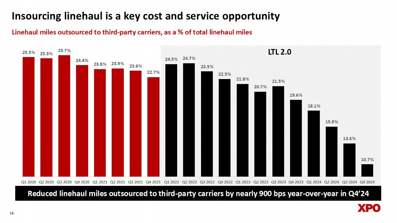 $18.34 $18.45 $18.90 $18.82 $19.11 $19.29 $20.02 $20.90 $20.76 $21.34 $21.43 $21.19 $21.06 $21.63 $22.81 $23.37 $23.13 $23.56 $24.34 $24.84 Q1 2020 Q2 2020 Q3 2020 Q4 2020 Q1 2021 Q2 2021 Q3 2021 Q4 2021 Q1 2022 Q2 2022 Q3 2022 Q4 2022 Q1 2023 Q2 2023 Q3 2023 Q4 2023 Q1 2024 Q2 2024 Q3 2024 Q4 2024 Earning price by delivering value through service excellence 15 Note: Gross revenue per hundredweight excludes the adjustment required for financial statement purposes in accordance with th e c ompany's revenue recognition policy Yield, excluding fuel, improved 6.3% year - over - year in Q4’24 Gross revenue per hundredweight (excluding fuel surcharges) LTL 2.0