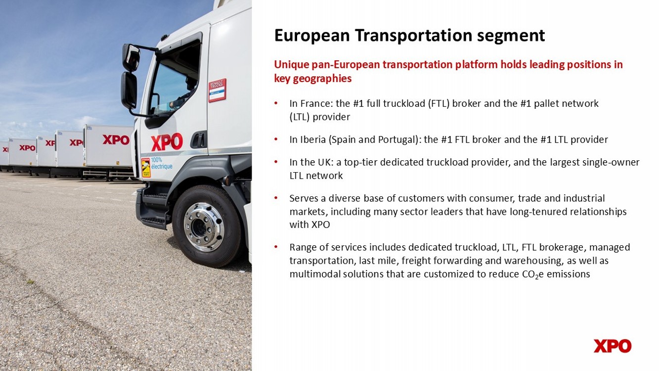 European Transportation segment • In France: the #1 full truckload (FTL) broker and the #1 pallet network (LTL) provider • In Iberia (Spain and Portugal): the #1 FTL broker and the #1 LTL provider • In the UK: a top - tier dedicated truckload provider, and the largest single - owner LTL network • Serves a diverse base of customers with consumer, trade and industrial markets, including many sector leaders that have long - tenured relationships with XPO • Range of services includes dedicated truckload, LTL, FTL brokerage, managed transportation, last mile, freight forwarding and warehousing, as well as multimodal solutions that are customized to reduce CO 2 e emissions Unique pan - European transportation platform holds leading positions in key geographies 19 19