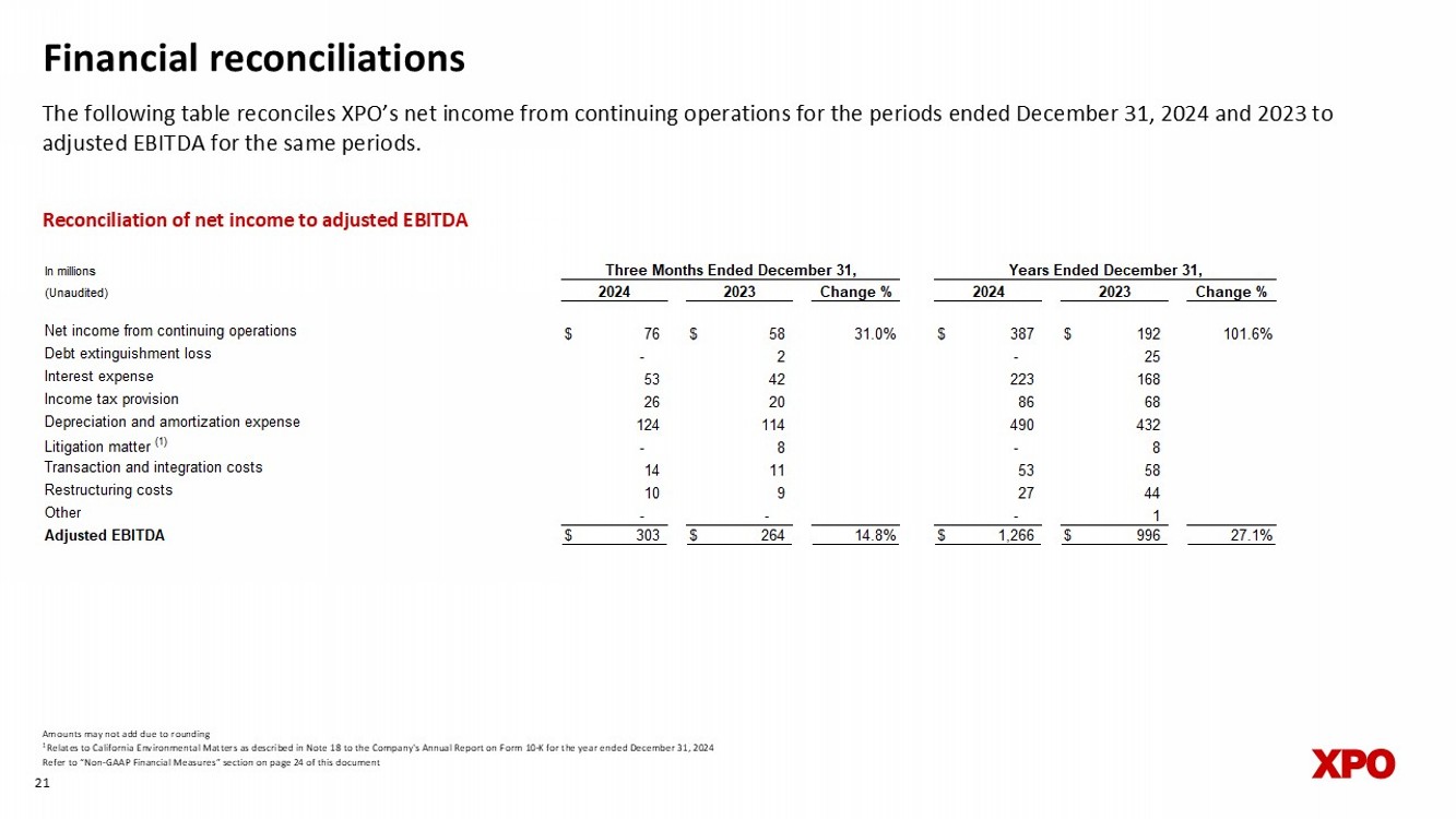 Financial reconciliations The following table reconciles XPO’s net income from continuing operations for the periods ended December 31, 2024 and 2023 t o adjusted EBITDA for the same periods. 21 Reconciliation of net income to adjusted EBITDA Amounts may not add due to rounding 1 Relates to California Environmental Matters as described in Note 18 to the Company's Annual Report on Form 10 - K for the year end ed December 31, 2024 Refer to “Non - GAAP Financial Measures” section on page 24 of this document In millions (Unaudited) Change % Change % Net income from continuing operations $ 76 $ 58 31.0% $ 387 $ 192 101.6% Debt extinguishment loss - 2 - 25 Interest expense 53 42 223 168 Income tax provision 26 20 86 68 Depreciation and amortization expense 124 114 490 432 Litigation matter (1) - 8 - 8 Transaction and integration costs 14 11 53 58 Restructuring costs 10 9 27 44 Other - - - 1 Adjusted EBITDA $ 303 $ 264 14.8% $ 1,266 $ 996 27.1% Years Ended December 31, 2024 2023 Three Months Ended December 31, 2024 2023