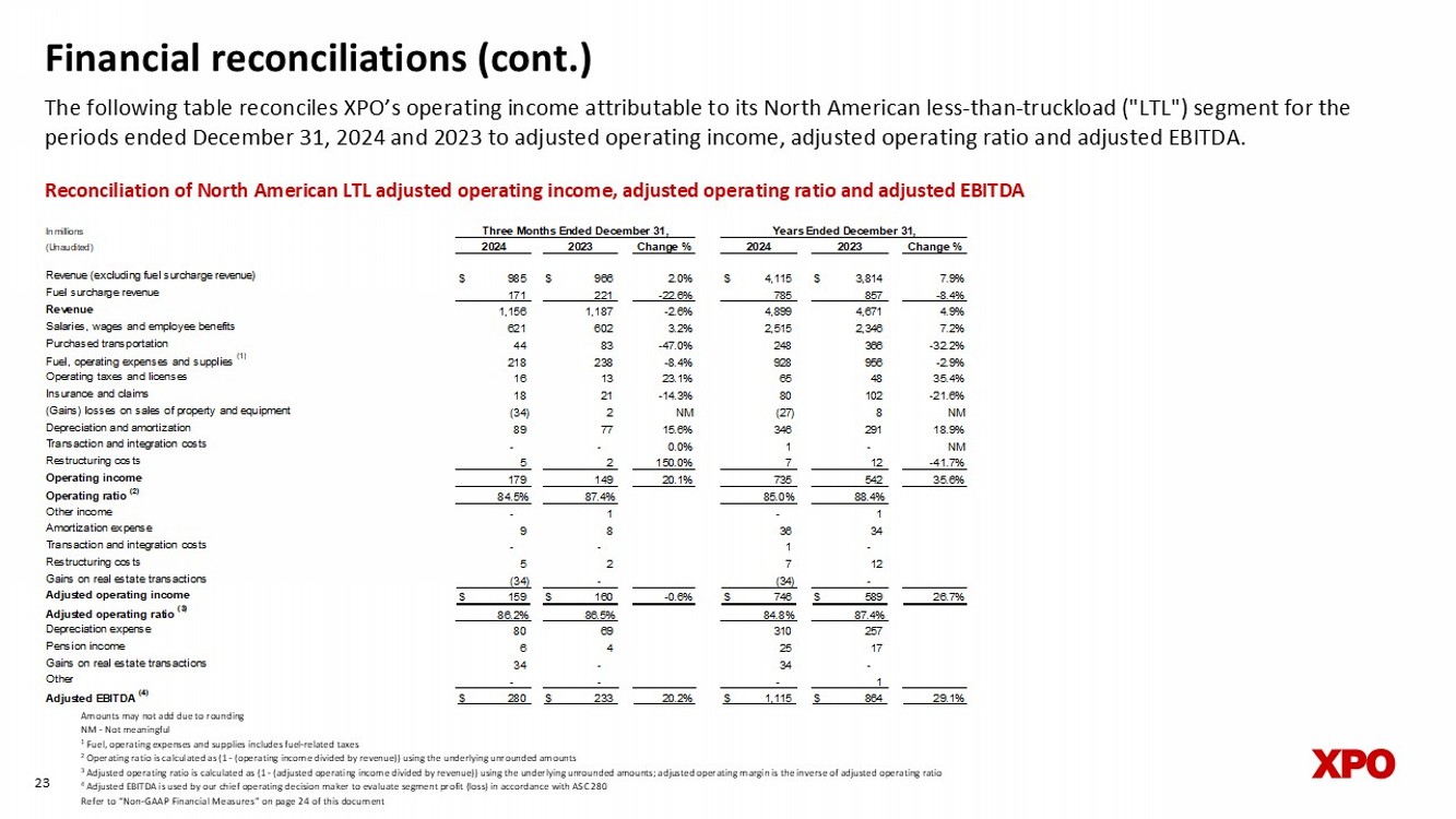 Financial reconciliations (cont.) The following table reconciles XPO’s operating income attributable to its North American less - than - truckload ("LTL") segment for the periods ended December 31, 2024 and 2023 to adjusted operating income, adjusted operating ratio and adjusted EBITDA. 23 Reconciliation of N orth American LTL adjusted operating income, adjusted operating ratio and adjusted EBITDA Amounts may not add due to rounding NM - Not meaningful 1 Fuel, operating expenses and supplies includes fuel - related taxes 2 Operating ratio is calculated as (1 - (operating income divided by revenue)) using the underlying unrounded amounts 3 Adjusted operating ratio is calculated as (1 - (adjusted operating income divided by revenue)) using the underlying unrounded am ounts; adjusted operating margin is the inverse of adjusted operating ratio 4 Adjusted EBITDA is used by our chief operating decision maker to evaluate segment profit (loss) in accordance with ASC 280 Refer to “Non - GAAP Financial Measures” on page 24 of this document In millions (Unaudited) Change % Change % Revenue (excluding fuel surcharge revenue) $ 985 $ 966 2.0% $ 4,115 $ 3,814 7.9% Fuel surcharge revenue 171 221 -22.6% 785 857 -8.4% Revenue 1,156 1,187 -2.6% 4,899 4,671 4.9% Salaries, wages and employee benefits 621 602 3.2% 2,515 2,346 7.2% Purchased transportation 44 83 -47.0% 248 366 -32.2% Fuel, operating expenses and supplies (1) 218 238 -8.4% 928 956 -2.9% Operating taxes and licenses 16 13 23.1% 65 48 35.4% Insurance and claims 18 21 -14.3% 80 102 -21.6% (Gains) losses on sales of property and equipment (34) 2 NM (27) 8 NM Depreciation and amortization 89 77 15.6% 346 291 18.9% Transaction and integration costs - - 0.0% 1 - NM Restructuring costs 5 2 150.0% 7 12 -41.7% Operating income 179 149 20.1% 735 542 35.6% Operating ratio (2) 84.5% 87.4% 85.0% 88.4% Other income - 1 - 1 Amortization expense 9 8 36 34 Transaction and integration costs - - 1 - Restructuring costs 5 2 7 12 Gains on real estate transactions (34) - (34) - Adjusted operating income $ 159 $ 160 -0.6% $ 746 $ 589 26.7% Adjusted operating ratio (3) 86.2% 86.5% 84.8% 87.4% Depreciation expense 80 69 310 257 Pension income 6 4 25 17 Gains on real estate transactions 34 - 34 - Other - - - 1 Adjusted EBITDA (4) $ 280 $ 233 20.2% $ 1,115 $ 864 29.1% 2024 2023 Three Months Ended December 31, Years Ended December 31, 2024 2023